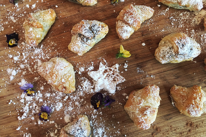 Knuspriger Blätterteig gefüllt mit süßen und salzigen Zutaten wird handgefertigt und von feinster Qualität gebacken.